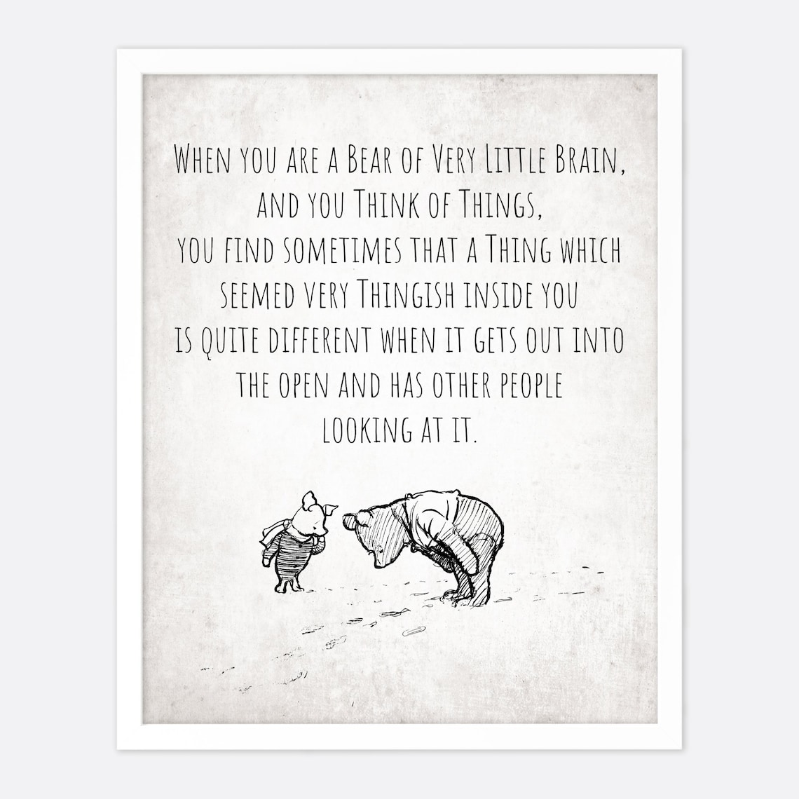 "And he has Brain." "Yes," said Piglet, "Rabbit has Brain." There was a long silence. "I suppose," said Pooh, "that that's why he never understands anything." ― A.A. Milne, Winnie-the-Pooh.. "When you are a Bear of Very Little Brain, and you Think of Things, you find sometimes that a Thing which seemed very Thingish inside you is quite.