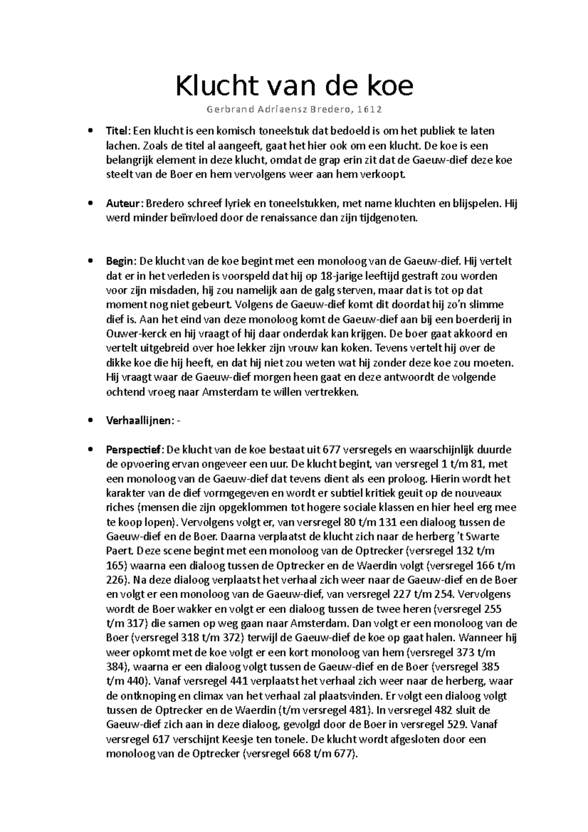 Samenvatting Boekverslag HAVO/VWO DE KLUCHT VAN DE KOE VAN G.A. BREDERO Nederlands Stuvia NL