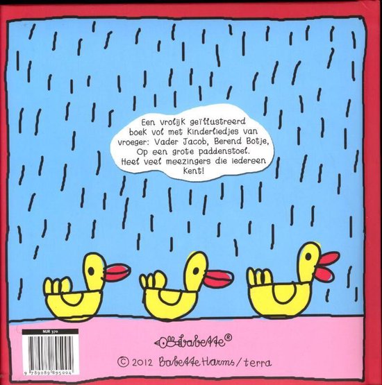 Onder moeders paraplu : de leukste kinderliedjes. Author: Babette Harms. Summary: Ruim 35 bekende liedjes, waaronder 'Alle eendjes', 'Het regent' en 'Hoedje van papier'. Met paginagrote tekeningen in heldere kleuren en tekst in een speelse letter. Vanaf ca. 2 t/m 6 jaar. NL-ZmNBD.