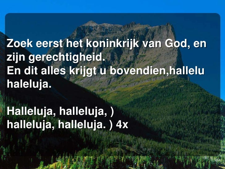 Songtekst. Opwekking. 40 - Zoek eerst het Koninkrijk van God. Zoek eerst het Koninkrijk van God. Zoekt eerst het koninkrijk van God en zijn gerechtigheid, en dit alles krijgt u bovendien. Hallelu, halleluja. Refrein: Halleluja, halleluja, halleluja, hallelu, halleluja.